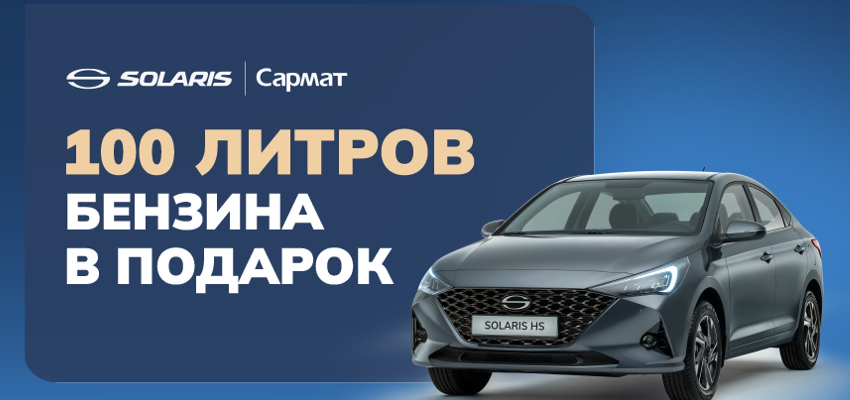 Дарим 100 литров бензина каждому, кто совершит покупку нового автомобиля Solaris HC или Solaris HS в период с 01.10.2025 - 30.11.2025. в автоцентре Сармат по адресу: Богдана Хмельницкого, 124 (Автоцентр Solaris).